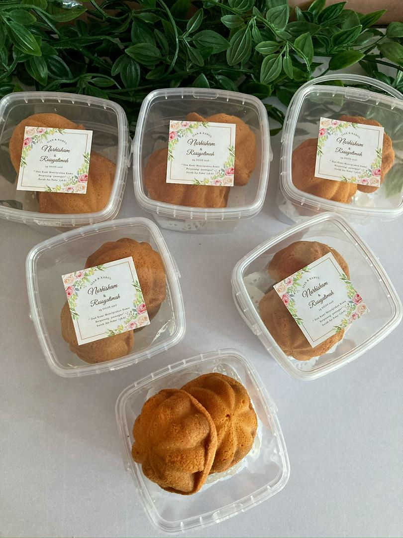 3pcs traditional bahulu packed in a transparent box with holder and a custom design sticker, a nostalgic and meaningful treat perfect for all ages.