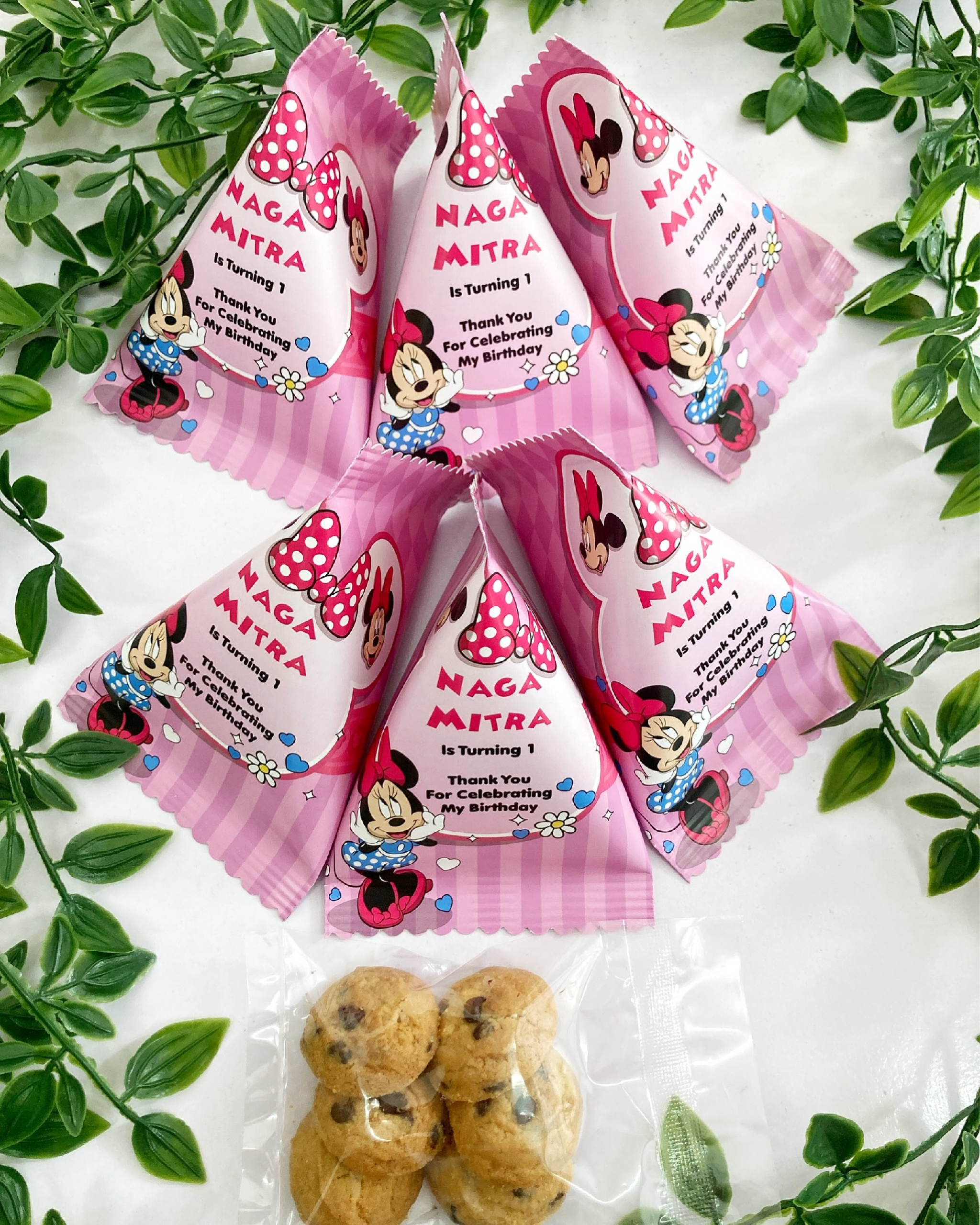 6pcs freshly baked chocolate chip cookies packed in a custom design goodies bag with personalized wording (Triangle 10x15cm), a sweet and simple party favorite.