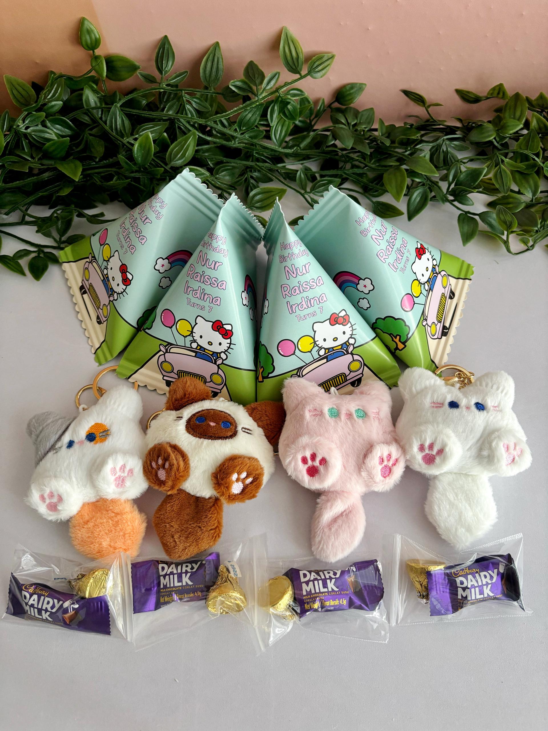 A cute cat plushie, Cadbury chocolate and chocolate kisses packed in a custom design goodies bag with personalized wording (Triangle 10x15cm), combining soft cuddles and sweet treats.