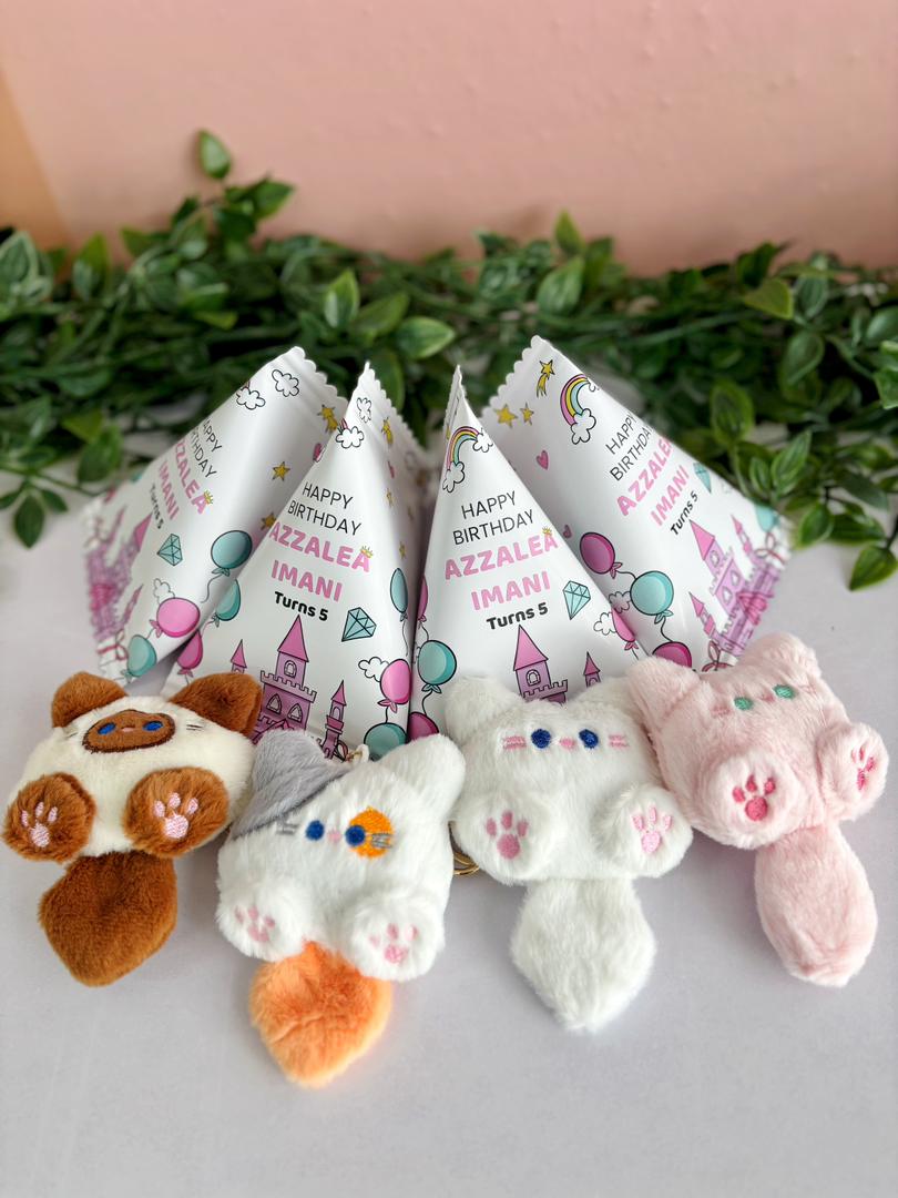 A cute cat plushie packed in a custom design goodies bag with personalized wording (Triangle 10x15cm), a soft and adorable keepsake gift.