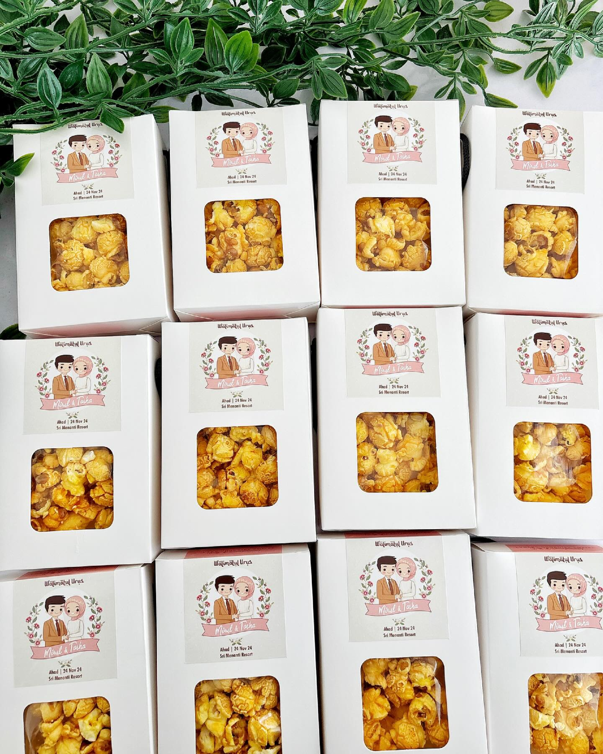βWhite Window Box w Handle Rope βCustom Design & Wording Sticker β20gram Caramel Popcorn