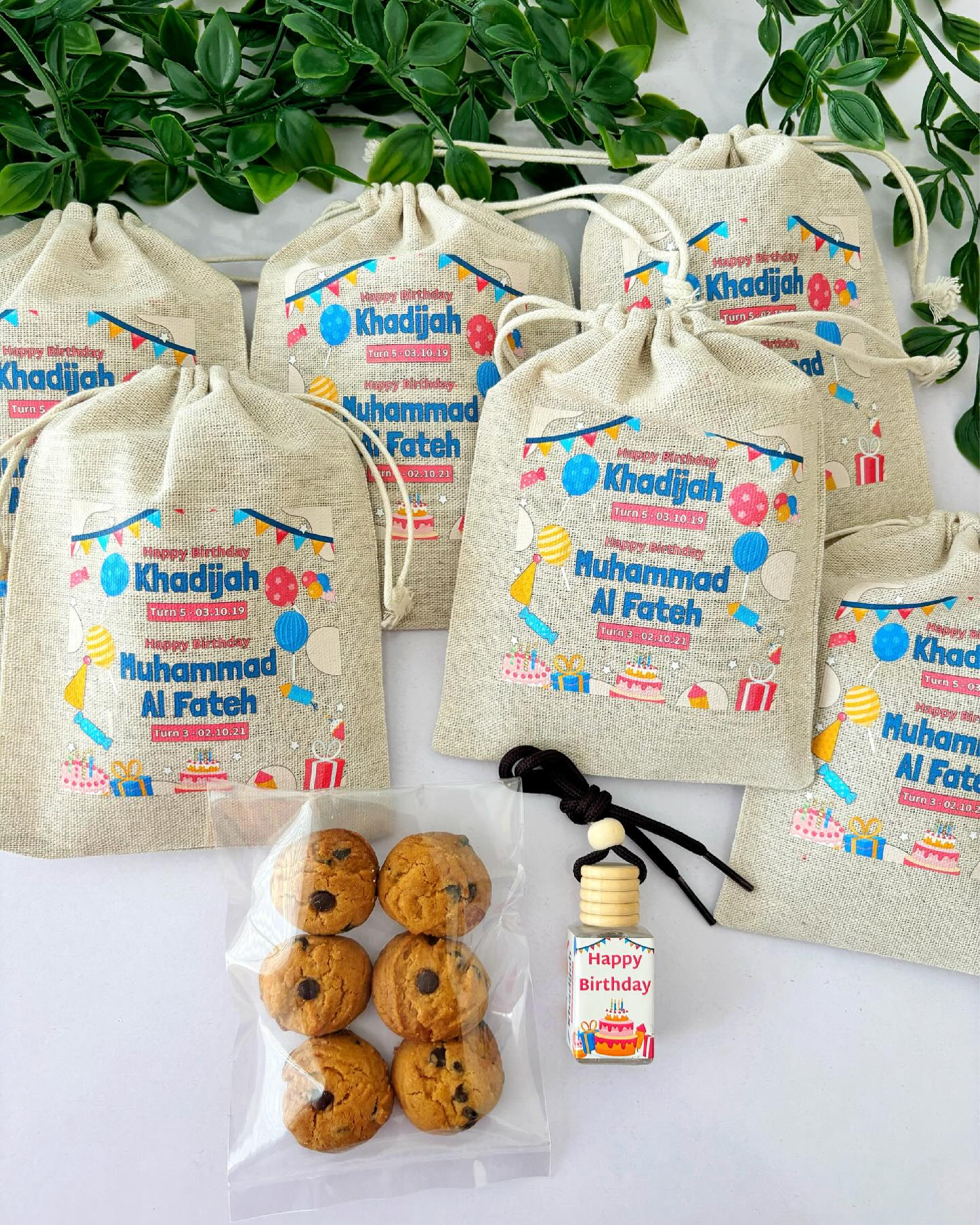 6pcs chocolate chip cookies and a hanging car perfume packed in a custom drawstring bag (12x17cm), a unique gift suitable for parents or teachers too.