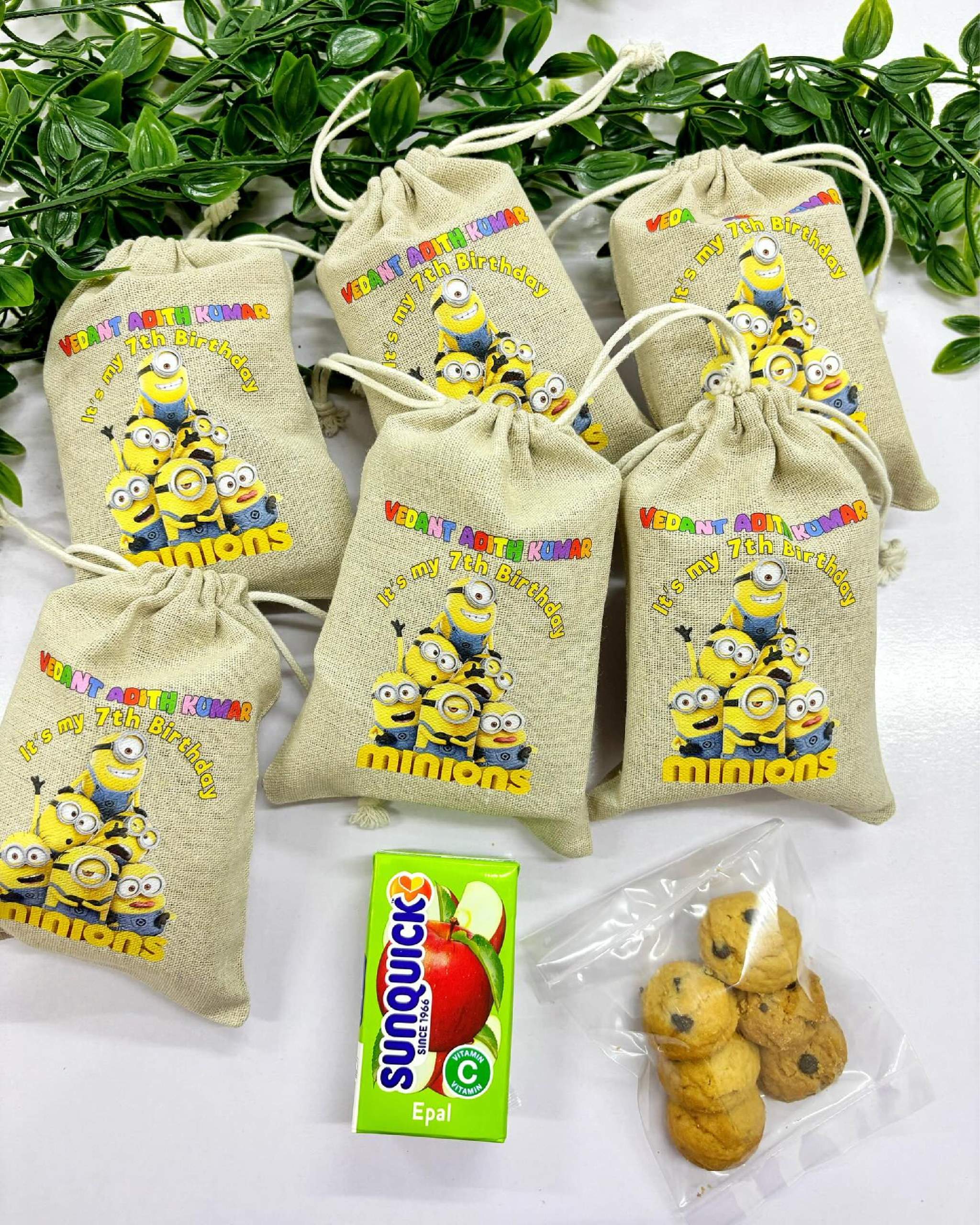 6pcs freshly baked cookies and a Sunquick juice drink packed in a custom drawstring bag (12x17cm), a ready-to-enjoy party snack kids love.